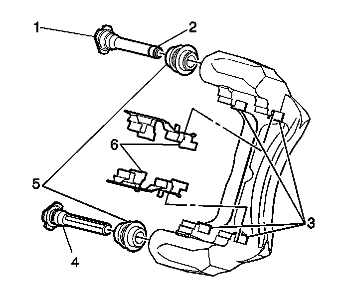 10. Inspect the brake caliper guide pins (1, 4) for freedom of movement, and inspect the condition of the guide pin boots (5). Move the guide pins inboard and outboard within the bracket bores, without disengaging the slides from the boots, and observe for the following: