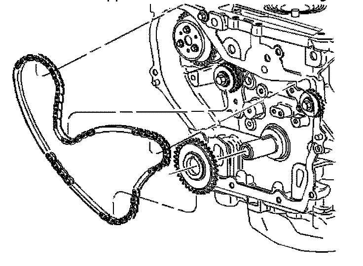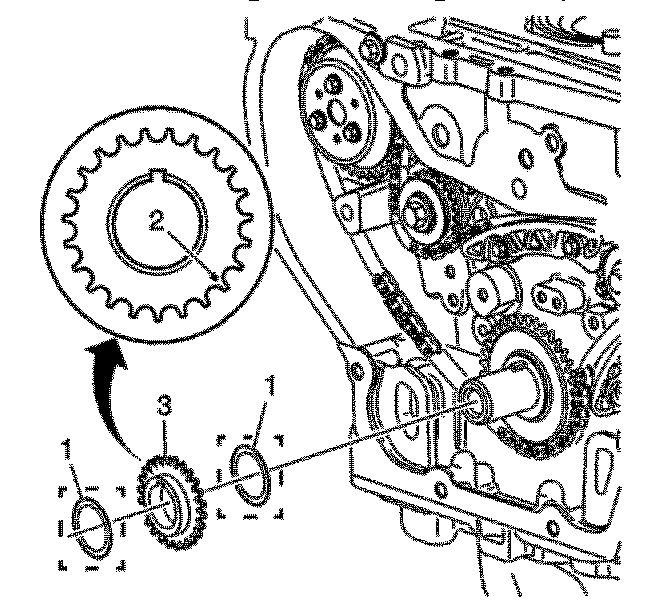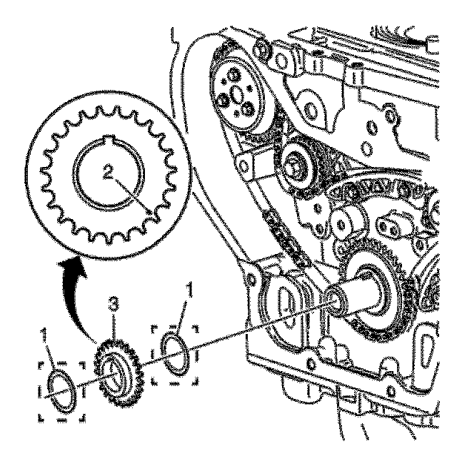 Note: Ecotec 4 cylinder engines with SIDI-Direct Injection, the lower timing chain crank gear may be equipped with a second spacing washer installed in front of the lower timing chain crank gear. The outer spacer/washer is in between the crank/balancer pulley and the lower timing gear and may remain in place when the pulley is removed. The spacer/washer has a dot/mark on its surface that may be mistaken for the lower timing mark. If applicable, the washer must be removed in order to view the correct timing mark on the lower crank gear.