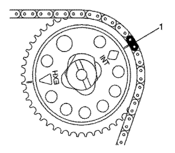 1.1. Place the uniquely colored link (1) so that it lines up with the timing mark on the intake side balance shaft sprocket.