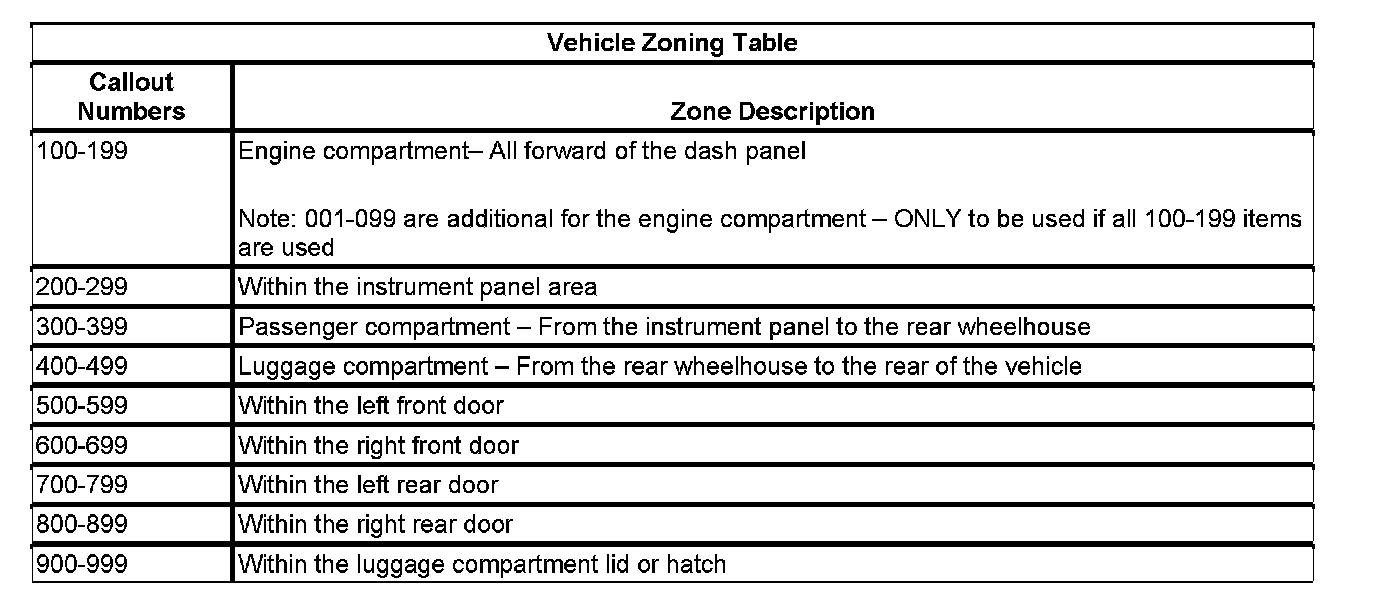 All grounds, in-line connectors, pass-through grommets, and splices have identifying numbers that correspond to where they are located in the vehicle. The above table explains the numbering system.