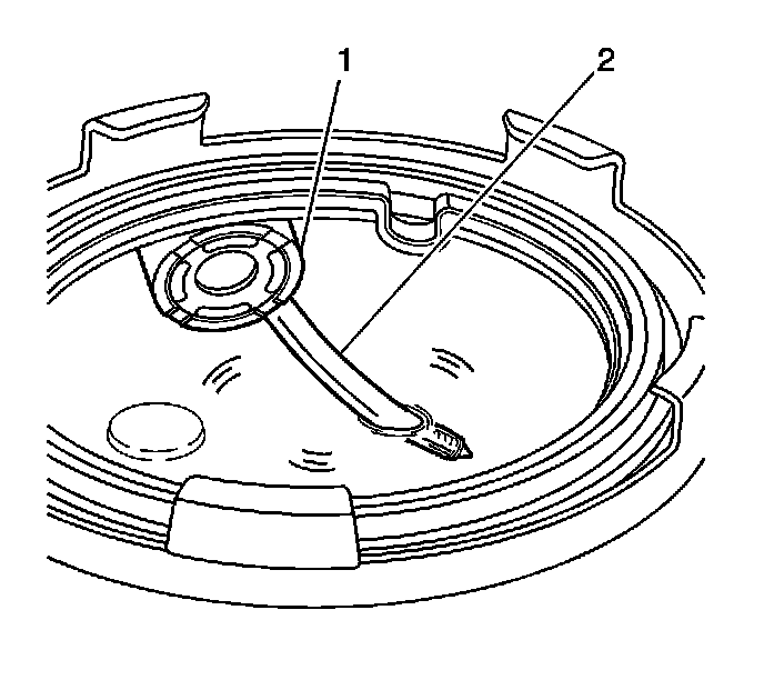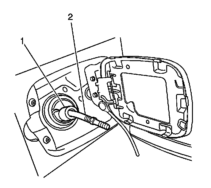 4. Continue to insert the J 43290 (2) into the filler pipe until the hose exits the valve (1) and reaches the bottom of the tank.