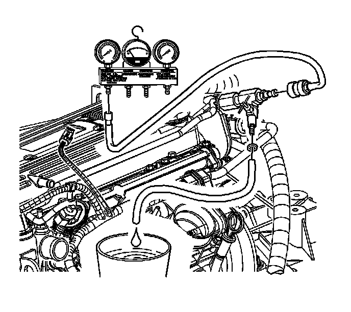 Caution: Wrap a shop towel around the fuel pressure connection in order to reduce the risk of fire and personal injury. The towel will absorb any fuel leakage that occurs during the connection of the fuel pressure gage. Place the towel in an approved container when the connection of the fuel pressure gage is complete.