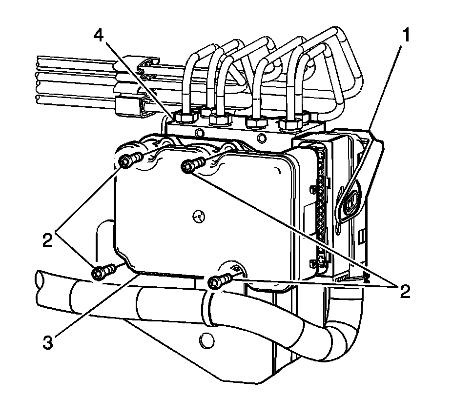 3. Clean the electronic brake control module (EBCM) (3) to brake pressure modulator valve (BPMV) (4) area of any accumulated dirt and foreign material.