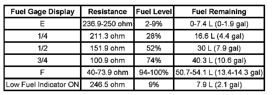 The information in this table is intended for use with the J33431-C Signal Generator and Instrument Panel Tester. The fuel level sensor values represent the test values to be used on the Signal Generator to drive the fuel gage display to the indicated positions. Vehicles that require more than one fuel level sensor calculate gage position from many possible resistance combinations of fuel levels between the two tanks. Therefore, the values in the table may not correlate directly to readings taken from the vehicle primary or secondary sending units.