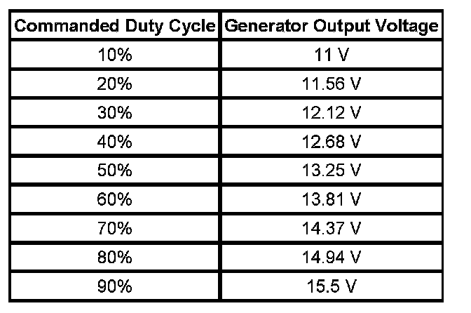 The engine control module (ECM) controls the generator through the generator L-terminal control circuit. The signal is a 5-volt pulse width modulation (PWM) signal of 128 Hz with a duty cycle of 0-100 percent. Normal duty cycle is between 5-95 percent. Between 0-5 percent and 95-100 percent are for diagnostic purposes. The following table shows the commanded duty cycle and output voltage of the generator: