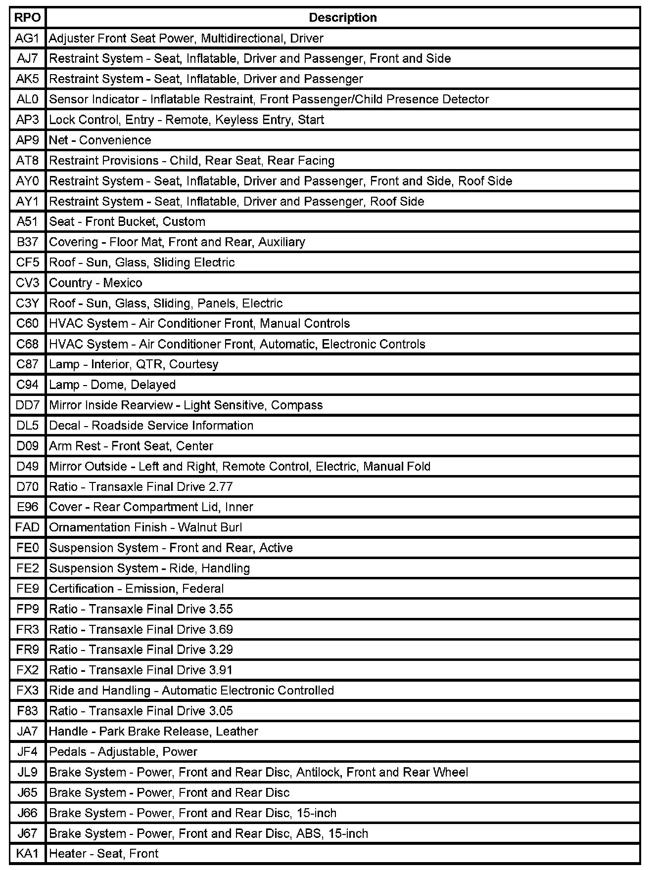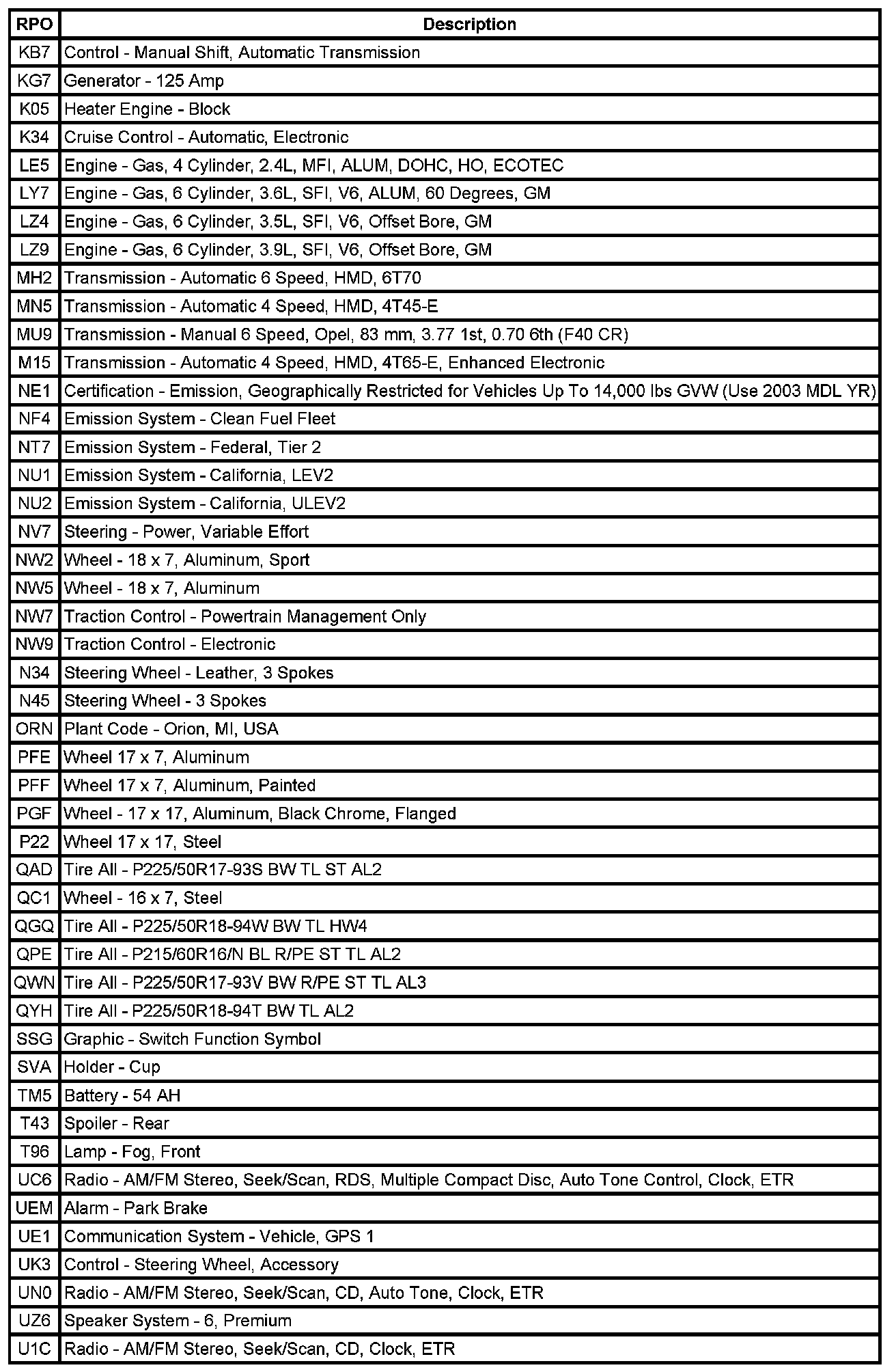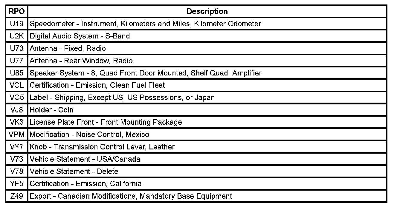 RPO Code List