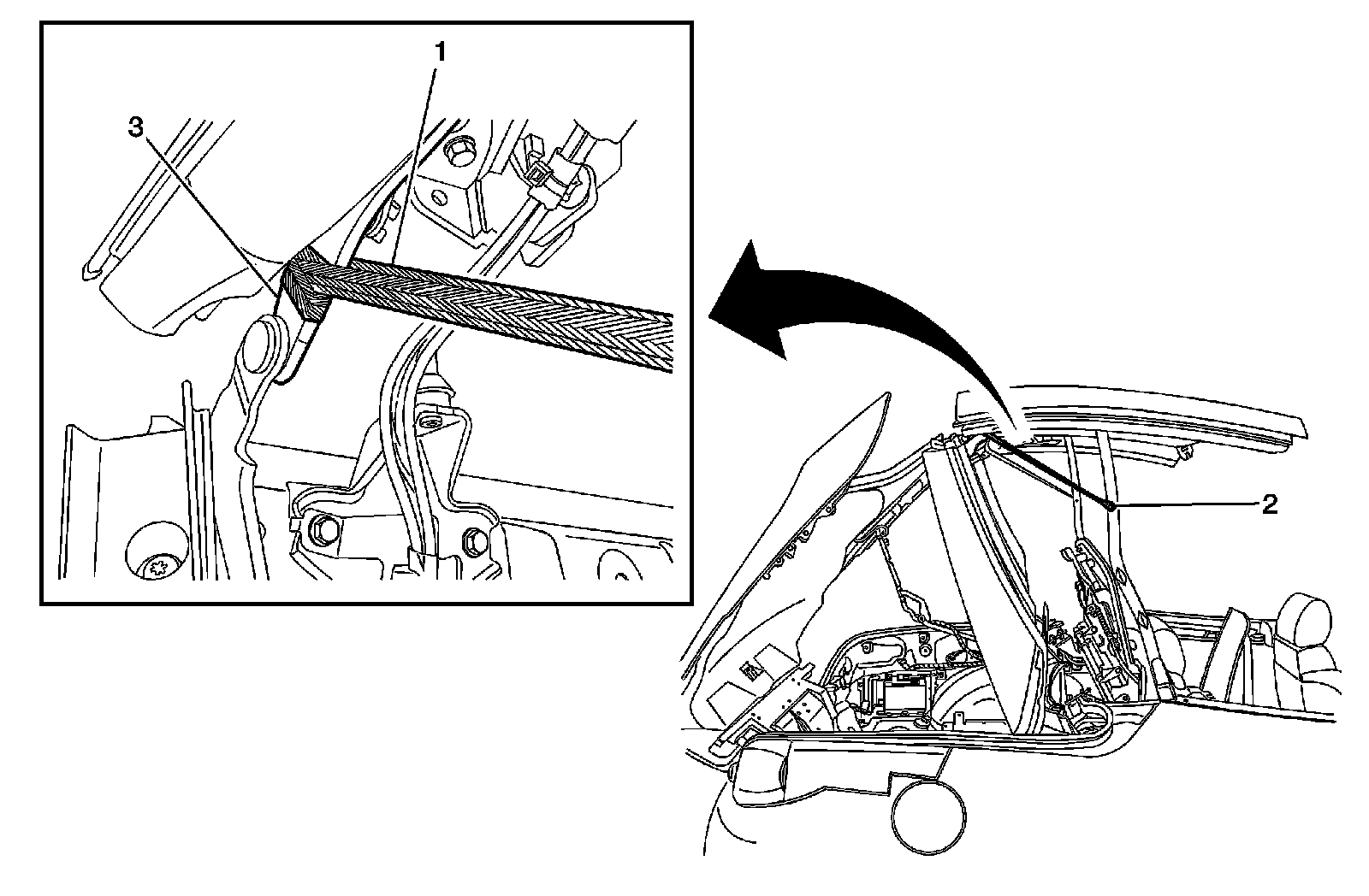 Important: If the folding top is not able to power, position can be achieved manually. With the aid of an assistant, open the folding top to the above position shown and carefully hold the top until the straps can be installed. Use special tool BO-48120 or equivalent to hold the folding top in place.