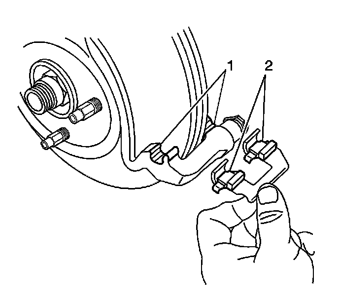 10. Remove the brake pad retainers (2) from the disc brake caliper bracket.