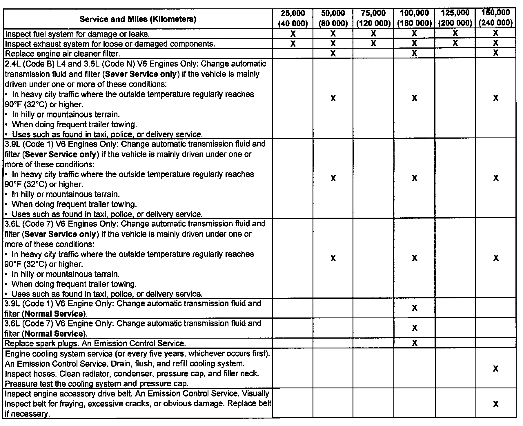 service (I or II) after the indicated miles (kilometers) shown for each item.