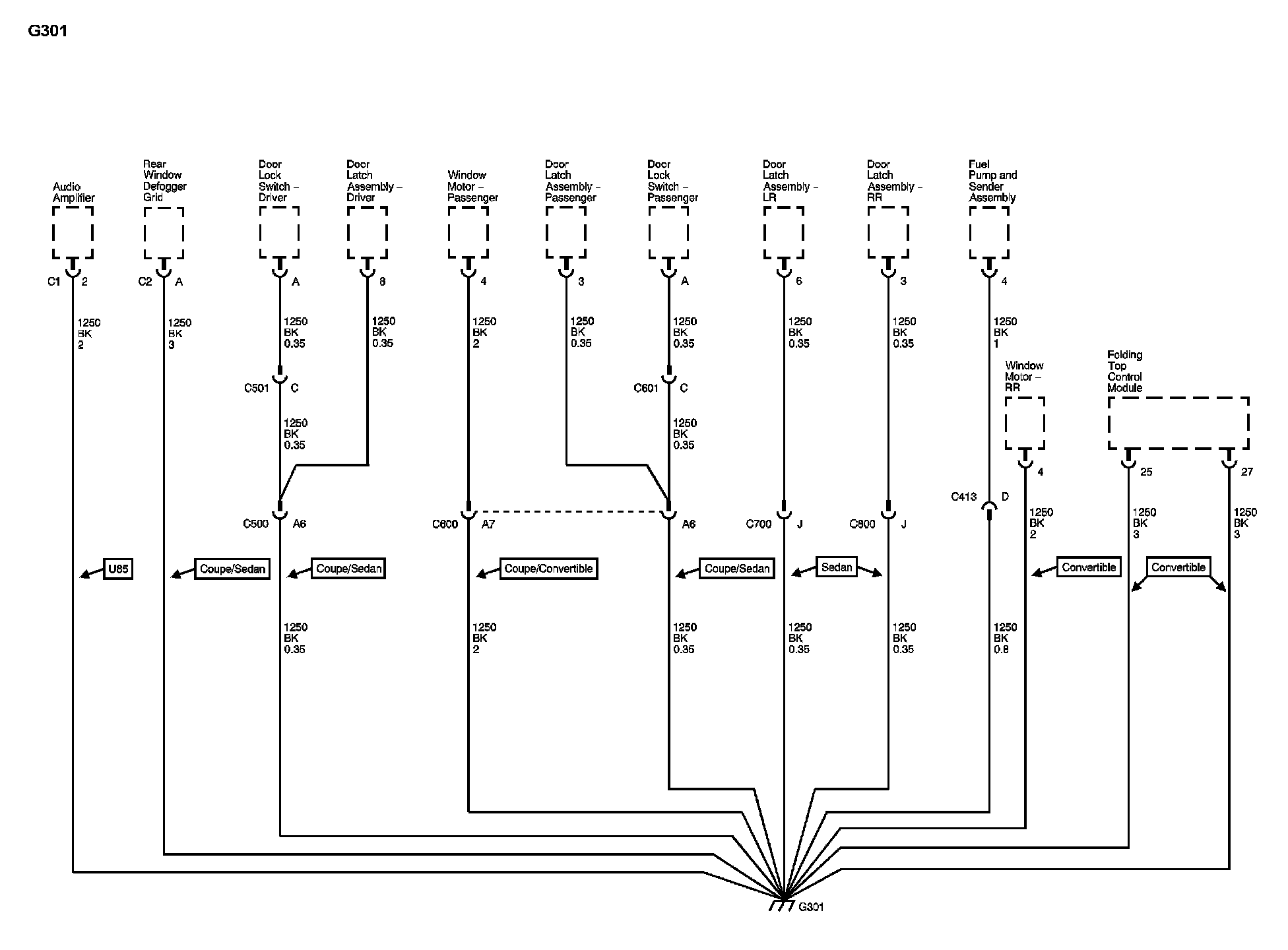 The locations for the Connectors, Grounds, Splices, and Grommets shown within these diagrams can be found via their numbers at Vehicle Locations.