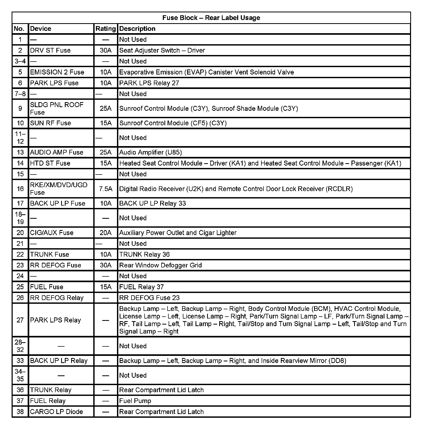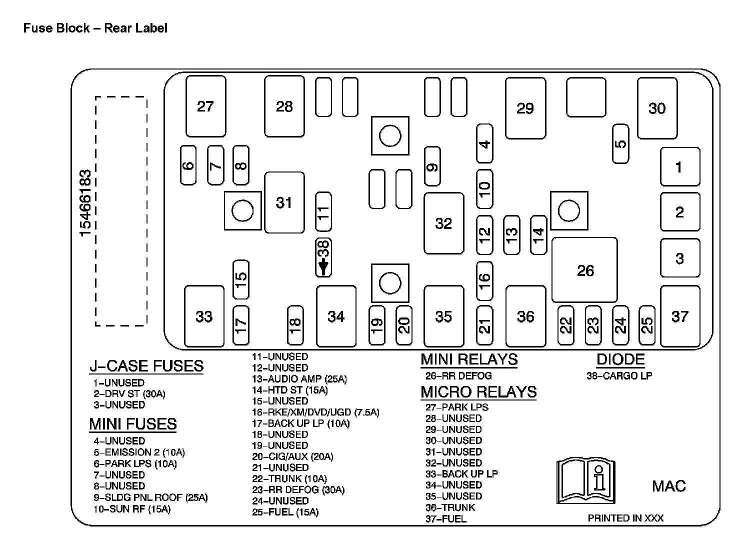 Fuse Block - Rear Label Usage: