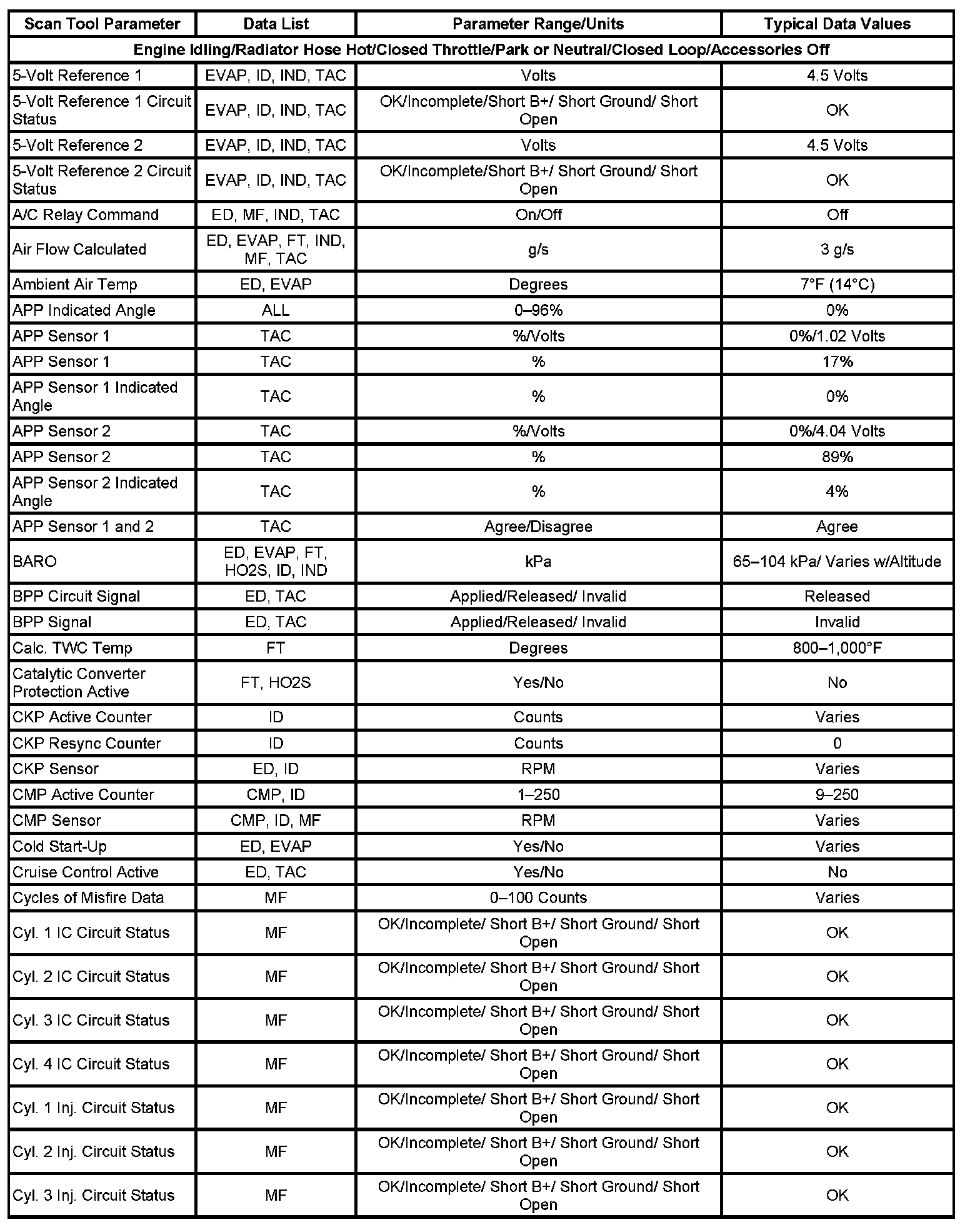 The Engine Scan Tool Data List contains all engine related parameters that are available on the scan tool. The list is arranged in alphabetical order. A given parameter may appear in any one of the data lists, and in some cases may appear more than once, or in more than one data list in order to group certain related parameters together.