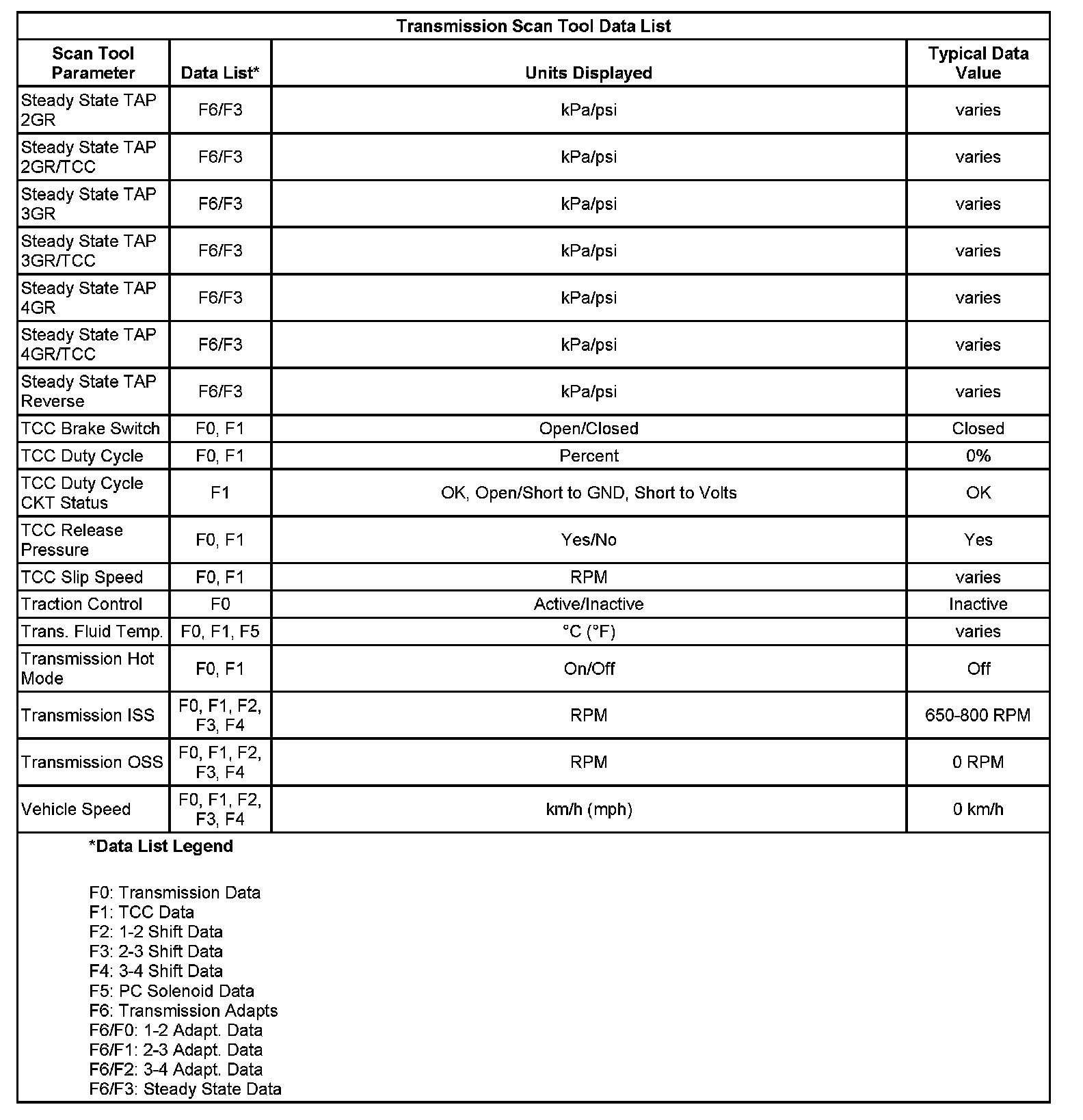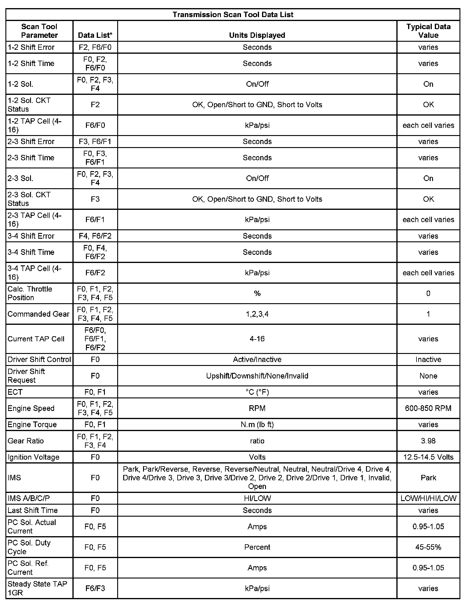 Only the parameters listed below are used in this manual for diagnosing. If a scan tool displays other parameters, the values are not recommended by General Motors for use in diagnosis.