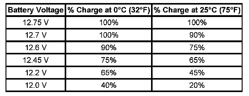 Important: Using voltage to determine the batteries state of charge (SOC) is only accurate after the battery has been at rest for 24 hours. This is enough time for the acid in each cell to equalize. If the battery has been charged or discharged in the past 24 hours, the battery SOC will only be an estimate.