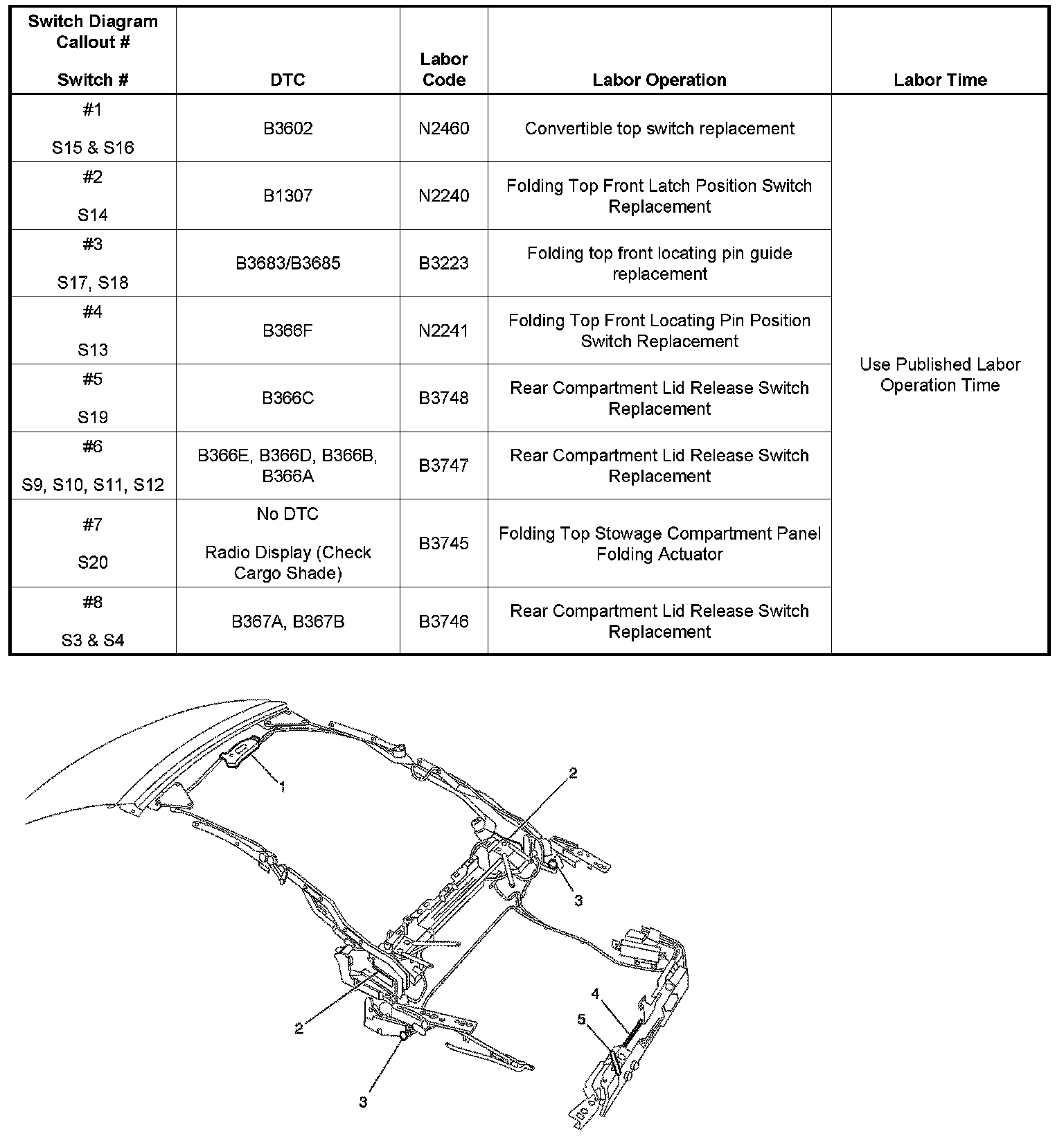 Using a Tech 2(R), the DTC Diagnostic Matrix and the Switch Status Charts, you can determine the status of each switch in any position while the top is being opened or closed. Also refer to the Training section below.