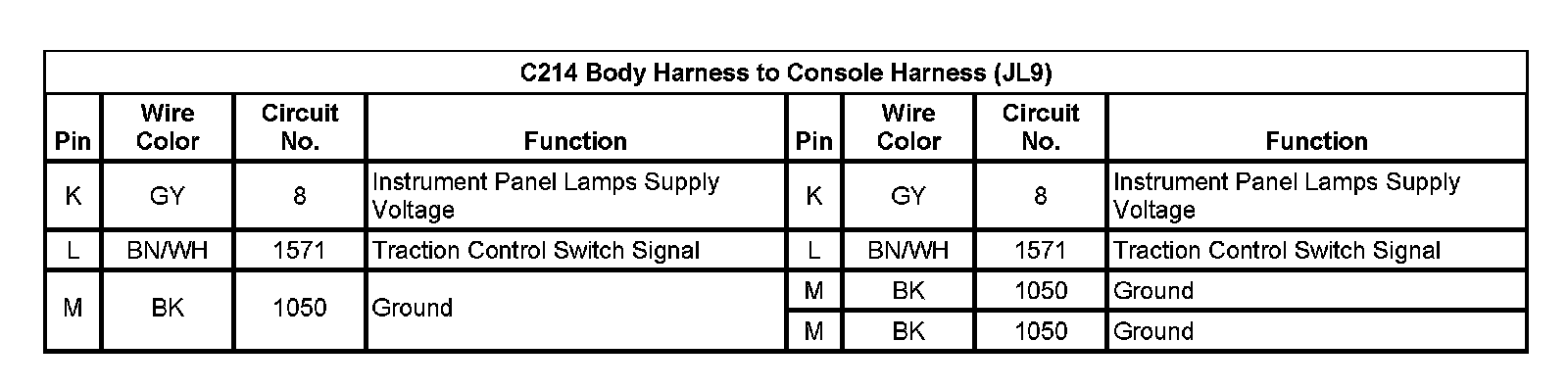C214 Body Harness To Console Harness (With RPO Code JL9) (Pin K To M):