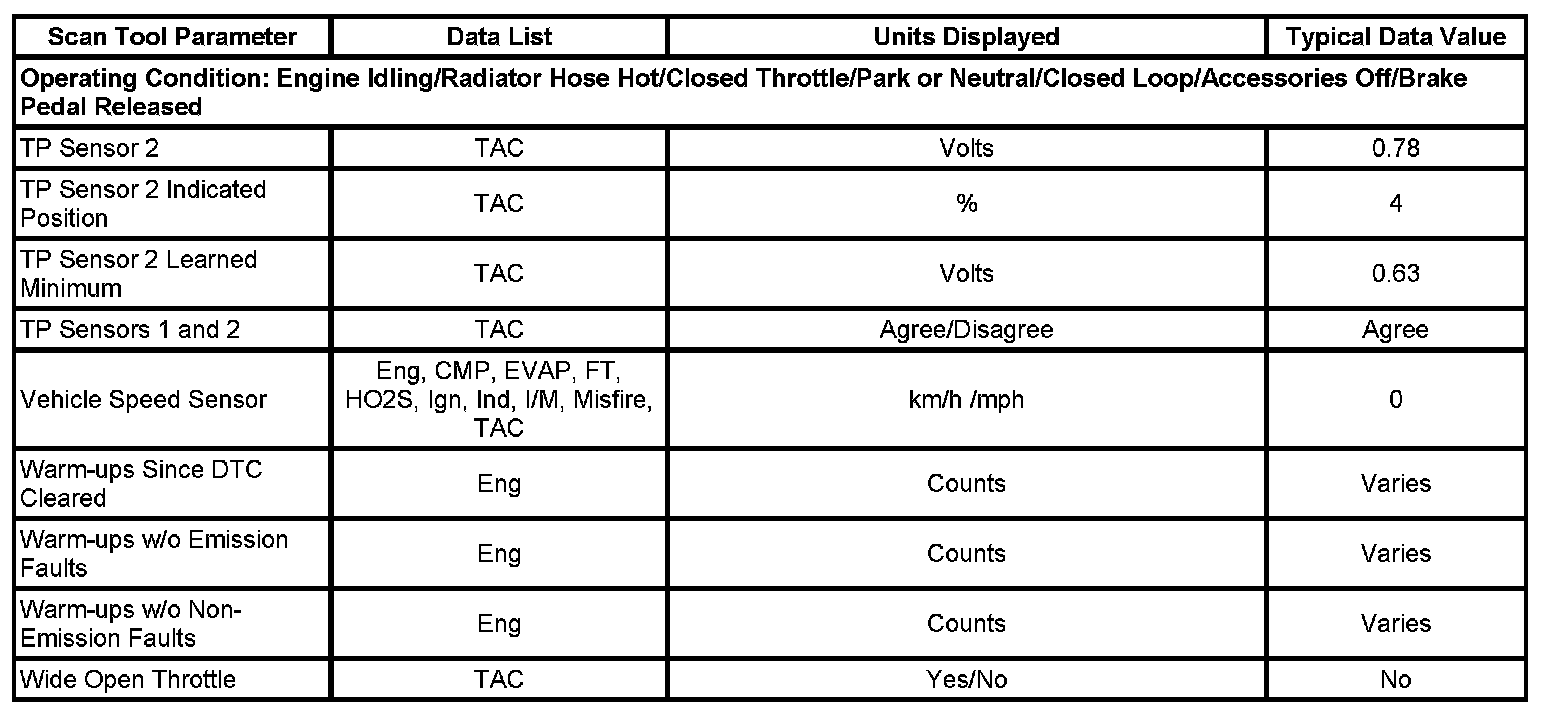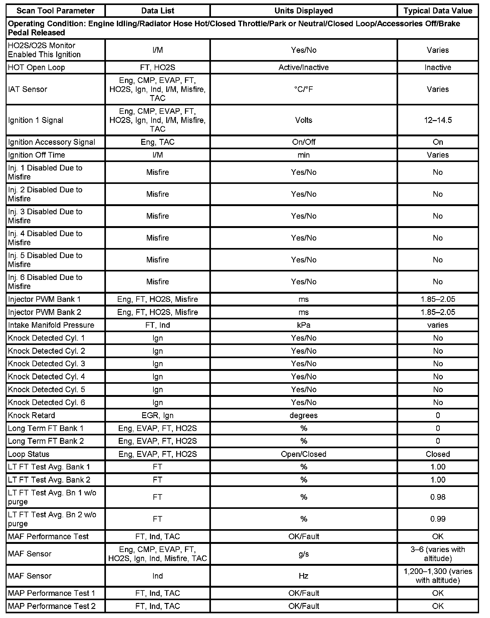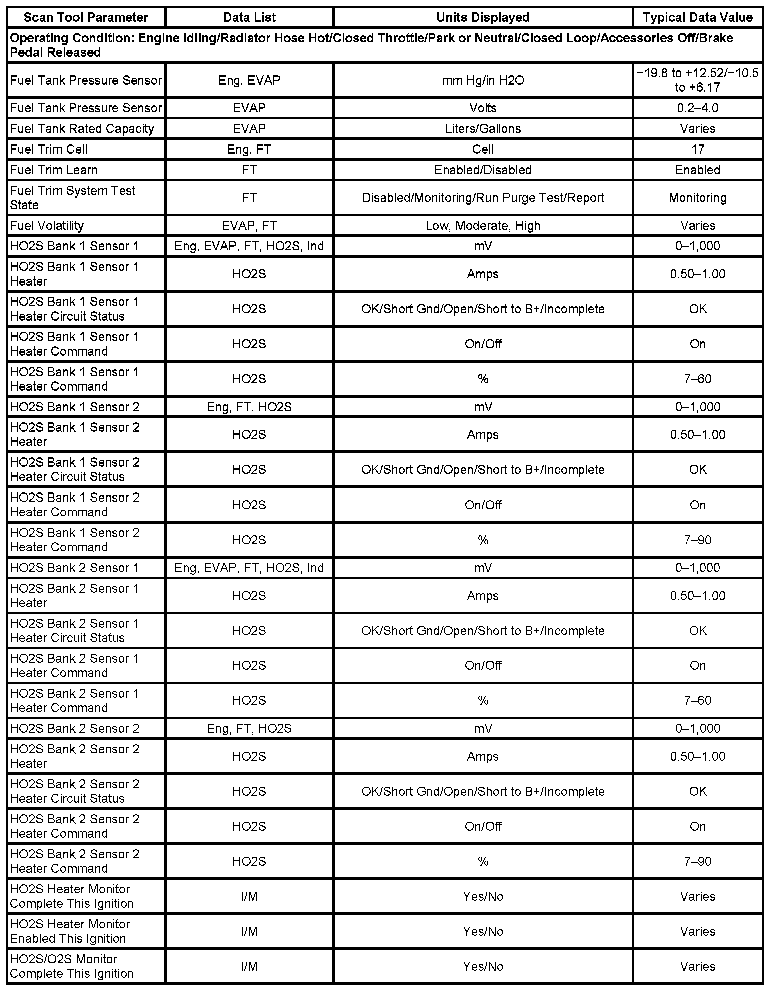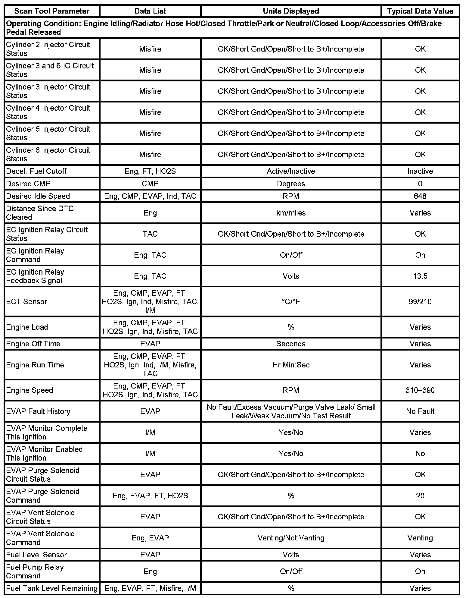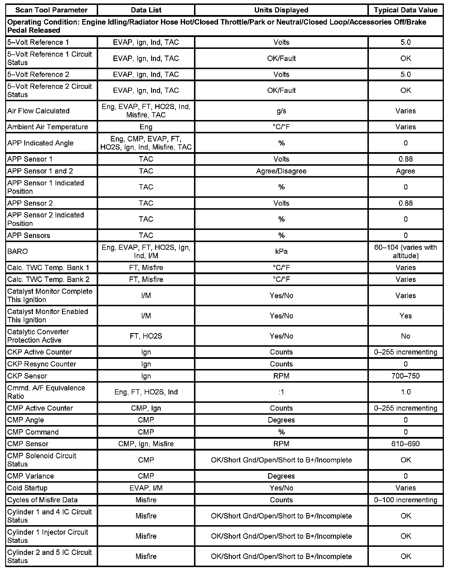 The Engine Scan Tool Data List contains all engine controls-related parameters that are available on the scan tool. The list is arranged in alphabetical order. A given parameter may appear in any one of the data lists, and in some cases may appear more than once, or in more than one data list in order to group certain related parameters together.
