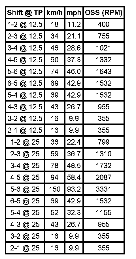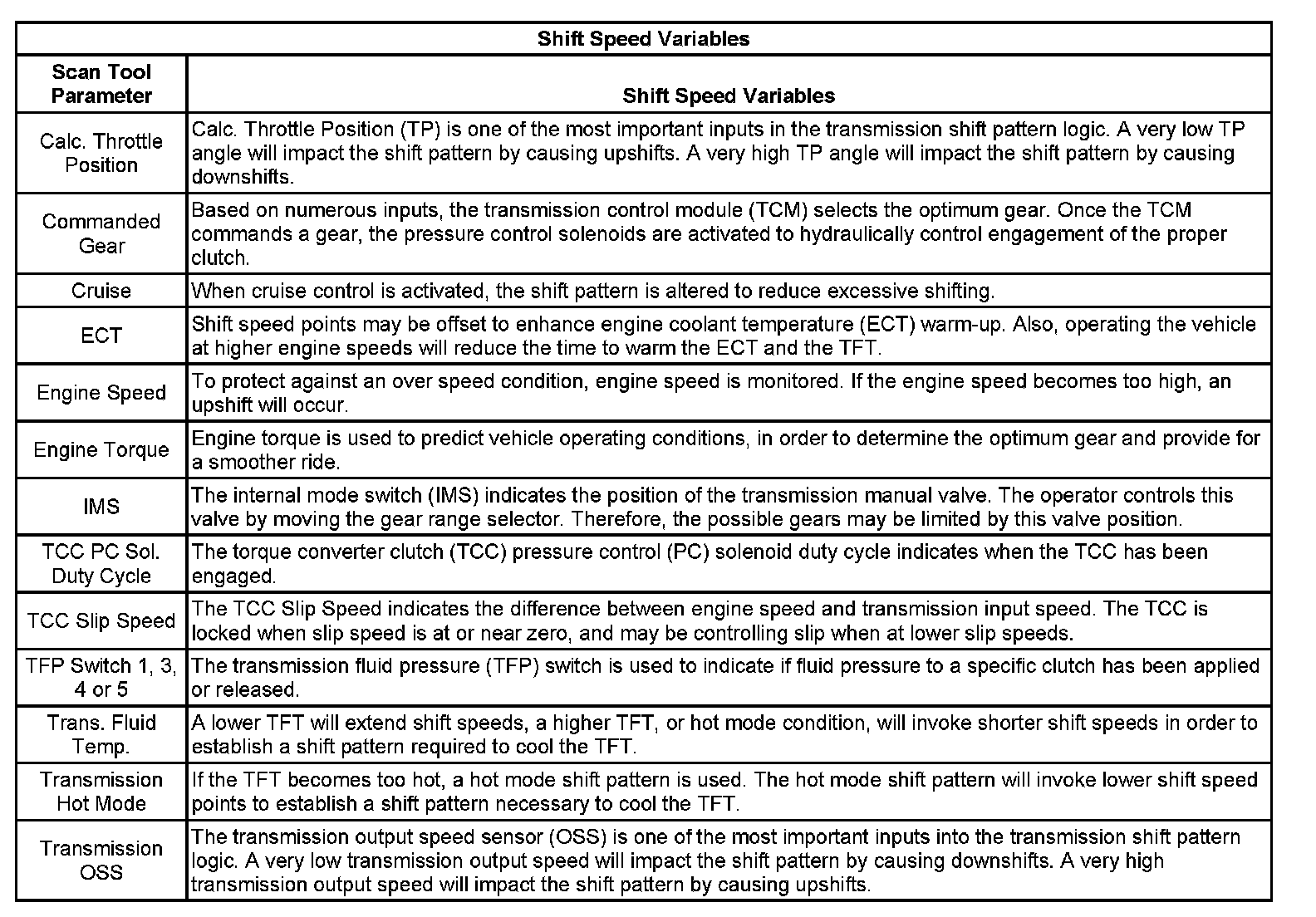 Important: Shift speed points are affected by many different vehicle and transmission operating conditions. The table above represents shift speed points calibrated at specific throttle angles during normal operating conditions and a temperature range between 0-130°C (32-266°F). These shift speed points are also based on an effective final drive ratio of 2.77, and assume a production-intent tire size. The table below illustrates a number of different variables that influence these shift speed points. Based on a given operating condition, these variables may override the normal shift speed points. To assist in monitoring the different variables, the respective scan tool data parameter is also listed.