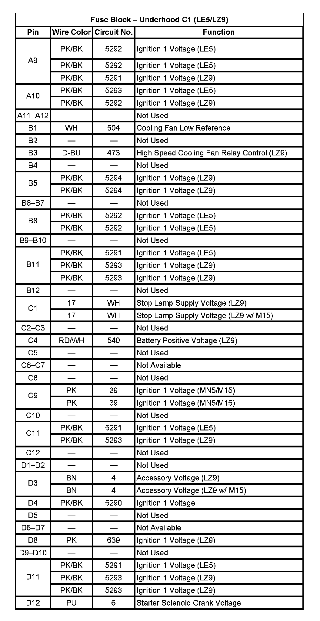 Fuse Block - Underhood C1 (LE5/LZ9) (Pin A9 To D12):
