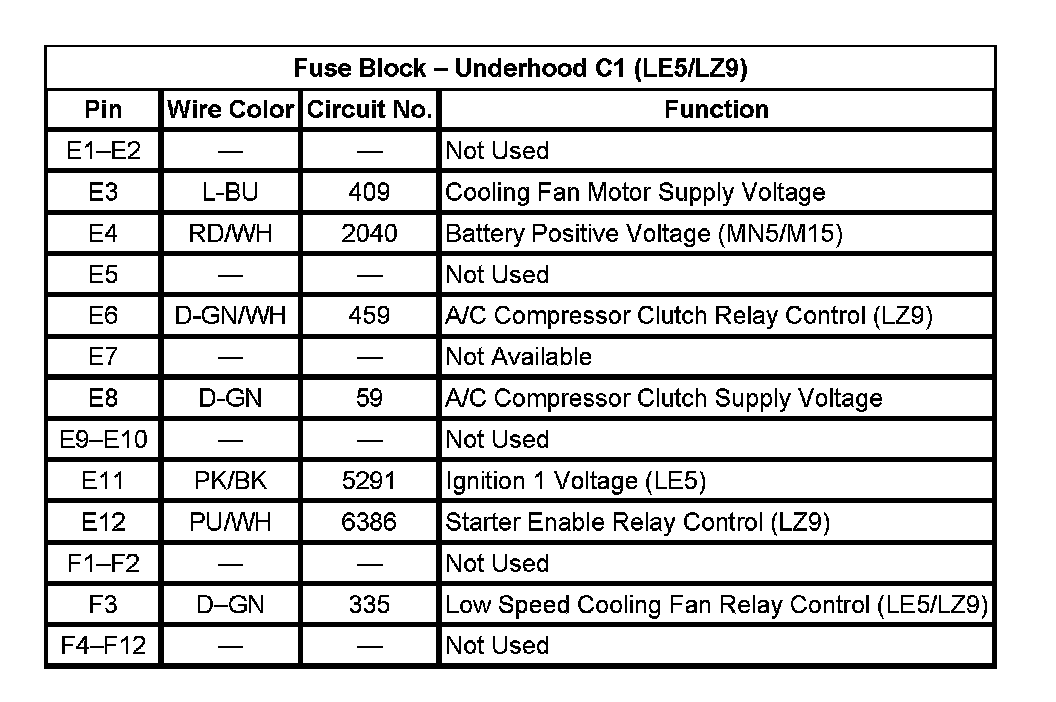 Fuse Block - Underhood C1 (LE5/LZ9) (Pin E1 To F12):