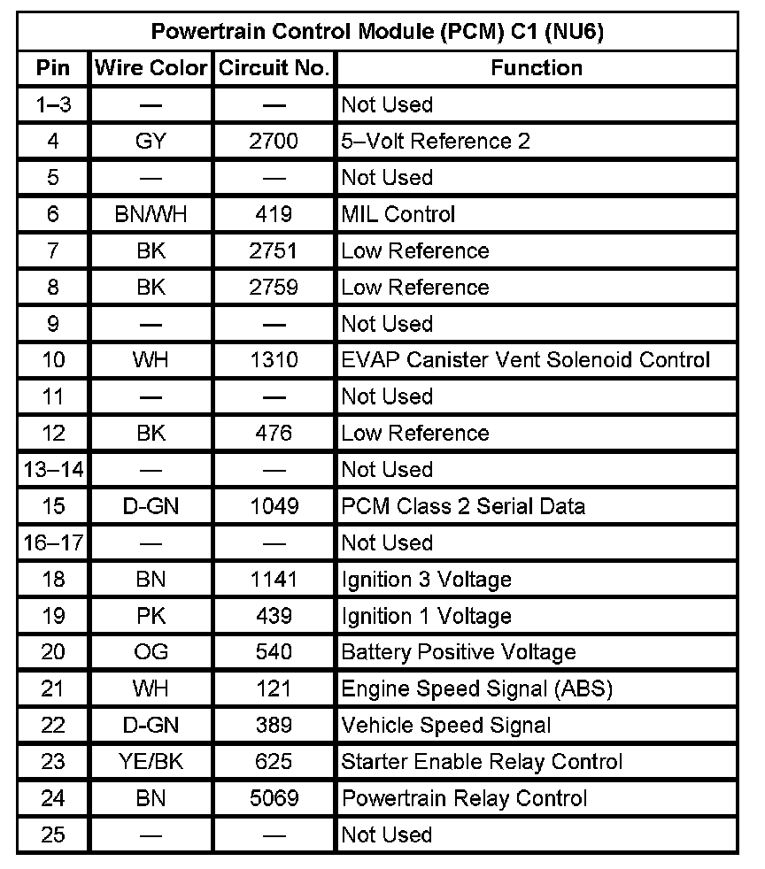 Powertrain Control Module (PCM) C1 (NU6) (Pin 1 To 25):