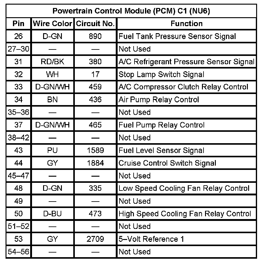 Powertrain Control Module (PCM) C1 (NU6) (Pin 26 To 56):