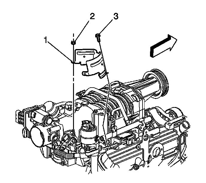 2. Remove the exhaust gas recirculation (EGR) valve heat shield (1), nut (2), and the bolt (3).
