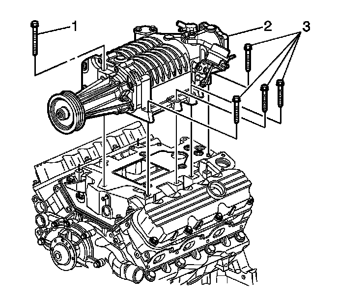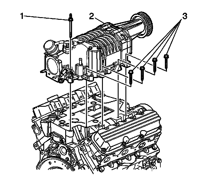 6. Install the left side supercharger bolts (1, 3).