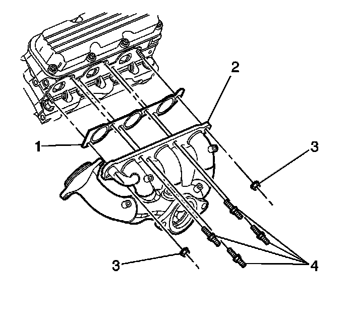 Install the right exhaust manifold studs (4) and the nuts (3).