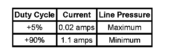 TCC duty cycle for ECCC equipped vehicles is 22 percent for minimum apply pressure and 43 percent for maximum apply pressure. The TCC PWM solenoid valve will typically be 40-60 percent at full apply. Your results may vary.