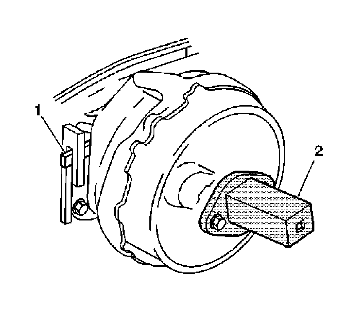 2. Turn the vacuum brake booster clockwise with a ratchet on the J 22805-B (2). DO NOT use a flat bladed tool in the locking tab to install the vacuum brake booster. When the vacuum brake booster is correctly installed, the locking tab (1) slides up the flange and engages the locking notch.