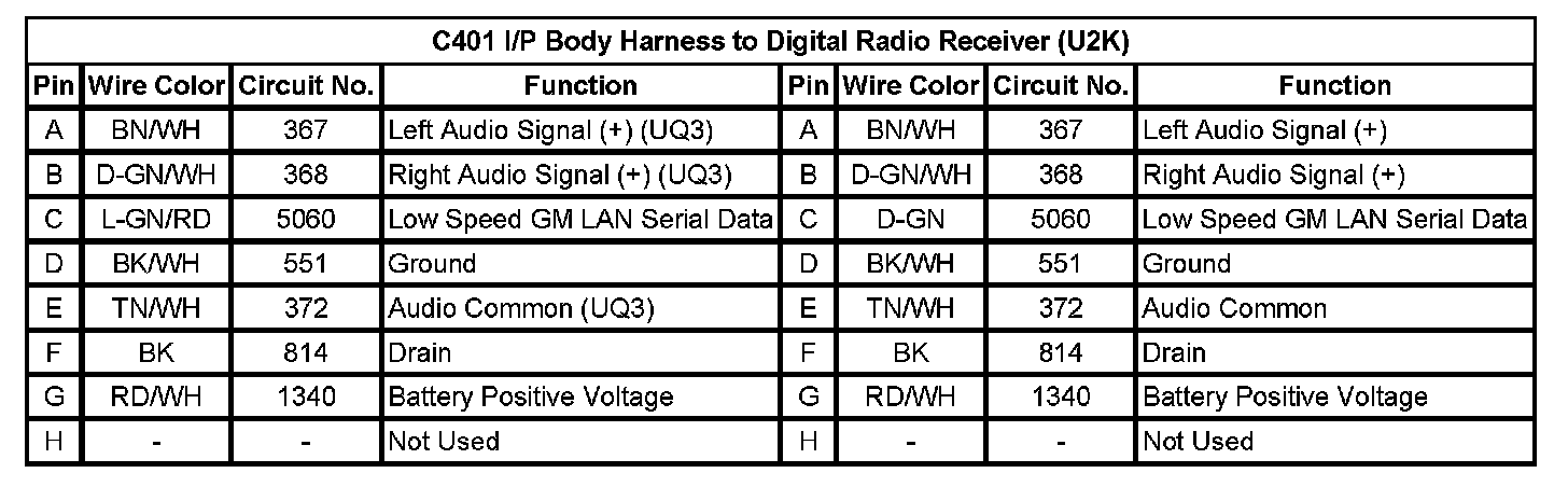 C401 I/P Body Harness to Digital Radio Receiver (U2K)