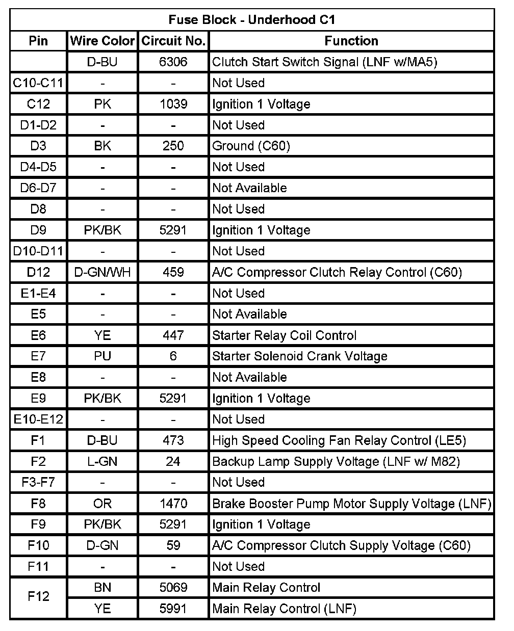 Fuse Block - Underhood C1 (Pin C10 To F12):