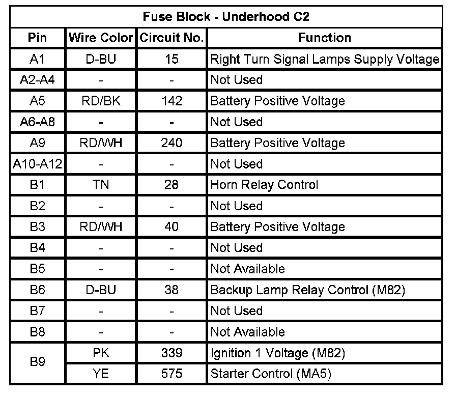 Fuse Block - Underhood C2 (Pin A1 To B9):