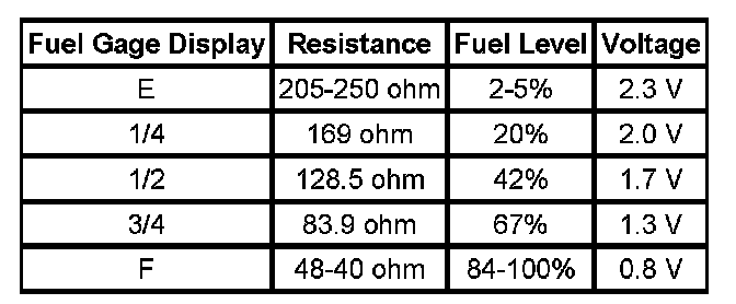 The information in this table is intended for use with the J 33431-C Signal Generator and Instrument Panel Tester. The fuel level sensor values represent the test values to be used on the Signal Generator to drive the fuel gage display to the indicated positions. Vehicles that require more than one fuel level sensor calculate gage position from many possible resistance combinations of fuel levels between the two tanks. Therefore, the values in the table may not correlate directly to readings taken from the vehicle primary or secondary sending units.