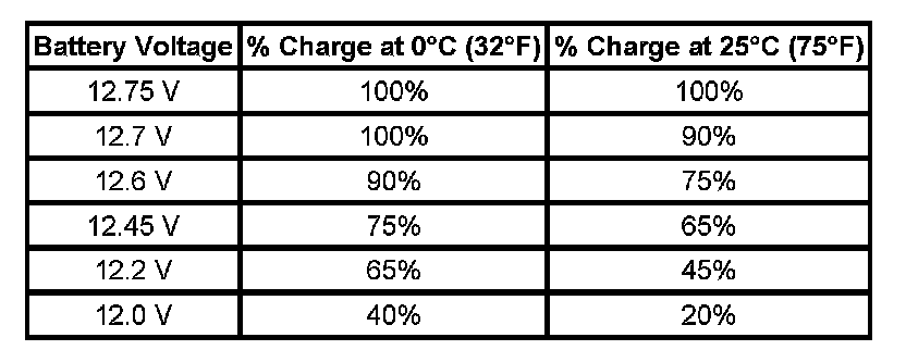 Important: Using voltage to determine the batteries state of charge (SOC) is only accurate after the battery has been at rest for 24 hours. This is enough time for the acid in each cell to equalize. If the battery has been charged or discharged in the past 24 hours, the battery SOC will only be an estimate.