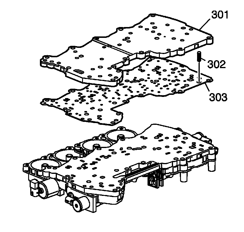 23. Remove the channel plate ball check spring (302) and the gasket (303).
