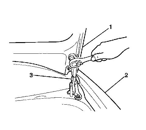 7. Remove the 2 mounting bolts which secure the hood (1) to each of the hood hinges (3).