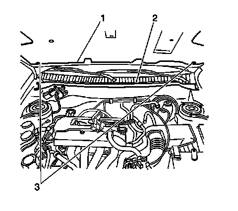 3. Remove the 2 plastic retainers (3) at the rear of the hood insulator (1).