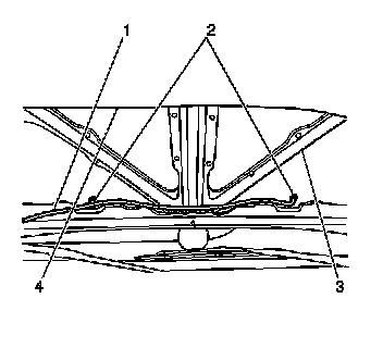 1. Install the hood (1) with the aid of a helper to the hood hinges (3), aligning the mating marks. Secure the hood with 2 mounting bolts at each hinge. Do not tighten fully.