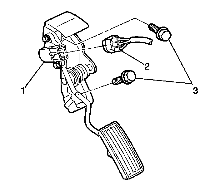 2. Remove the 2 fasteners (3) and the APP sensor and pedal assembly (1).