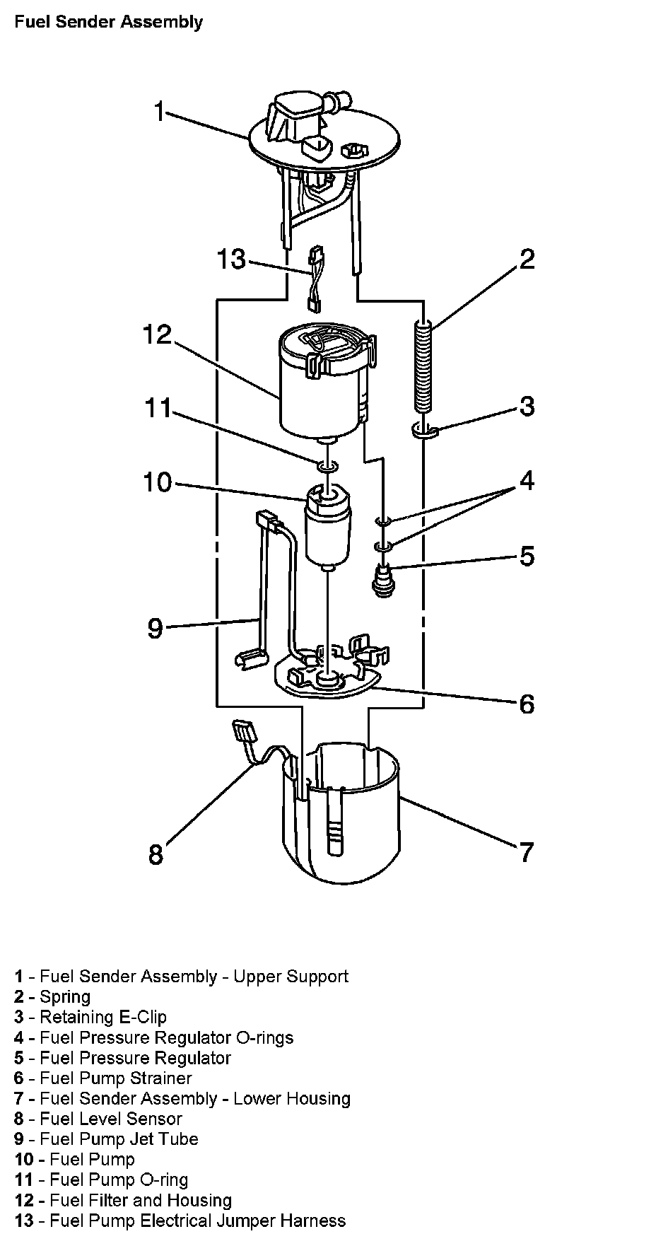 The fuel sender assembly is located in the fuel tank. The fuel sender assembly contains the electric fuel pump, the fuel level sensor, the fuel pressure regulator, and the fuel filter. Most of the fuel sender assembly components can be serviced separately.