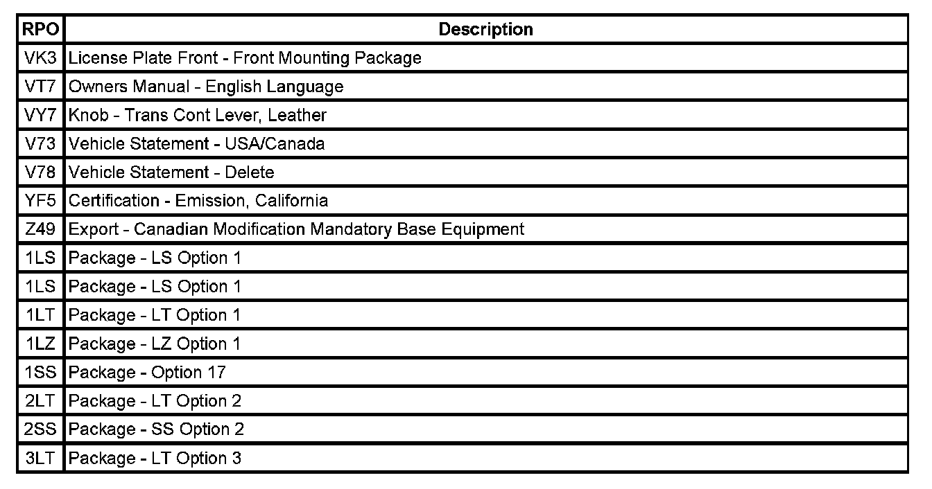 The following table provides the description of the Regular Production Option (RPO) codes that are available on the vehicle. The vehicle's RPO list is printed on the Service Parts Identification Label.