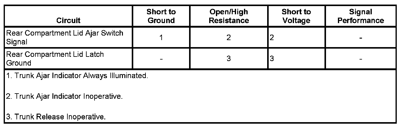 When the ignition is ON, the body control module (BCM) supplies battery positive voltage to the rear compartment lid ajar switch through the rear compartment lid ajar switch signal circuit. When the rear compartment lid is opened, the signal circuit is connected to ground through the rear compartment lid ajar switch ground circuit and the voltage is pulled low within the BCM. In response, the BCM sends a serial data message to the driver information center (DIC) in the instrument panel cluster (IPC) to illuminate the rear compartment lid ajar indicator.