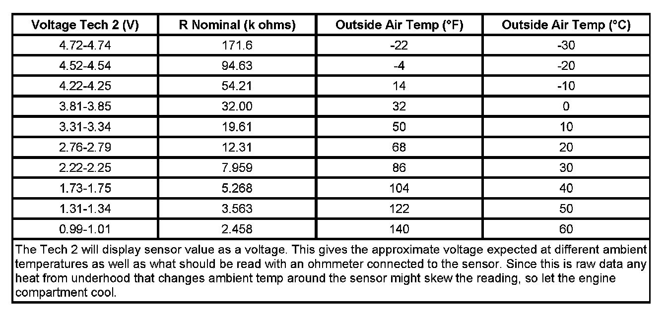 Sensor Resistance Table (Volts to Temp to Resistance)