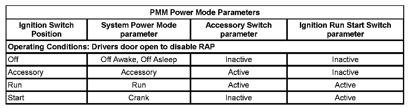 With a scan tool, compare all parameters listed with the corresponding ignition key position. The PMM Power Mode Parameters table below illustrates the correct state of the System Power Mode parameter and other parameters in correspondence to the actual ignition switch position.