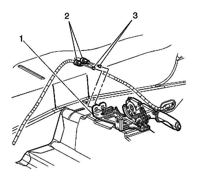 7. Release the rear cable fittings (2) from the park brake lever bracket (1).