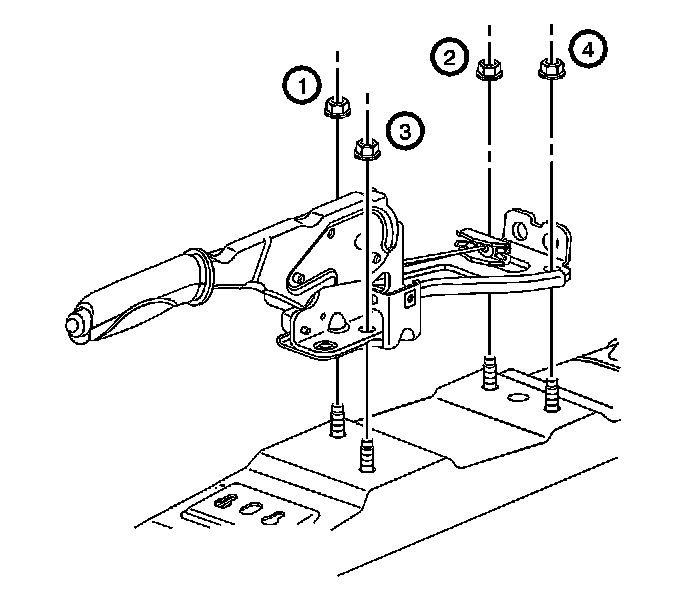 Important: Tighten the park brake lever assembly mounting nuts in the sequence shown.