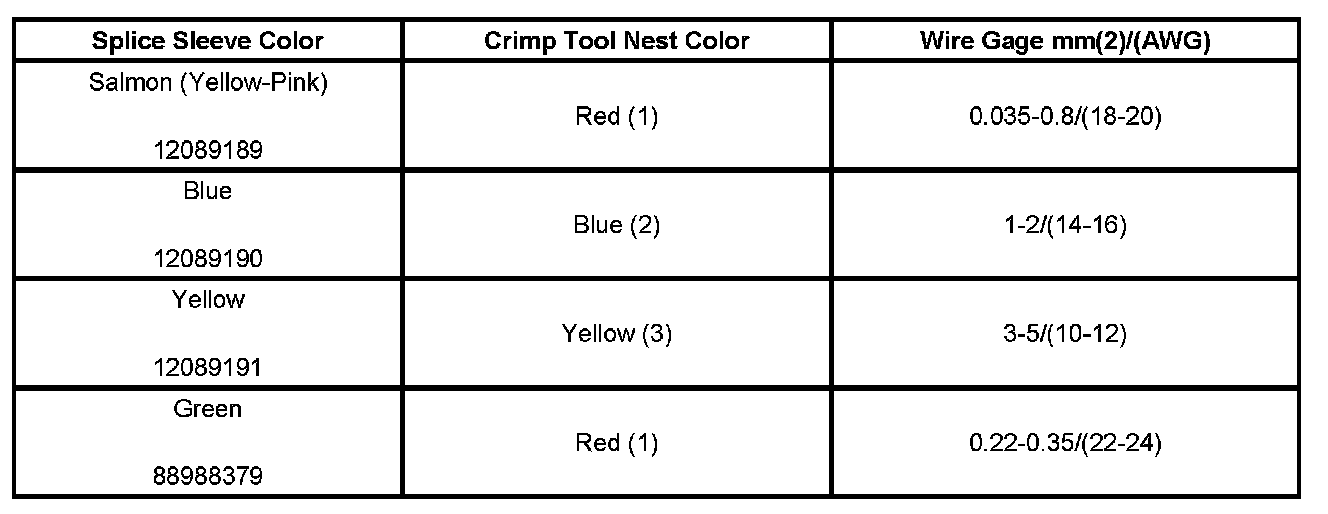 6. Select the proper DuraSeal splice sleeve according to the wire size. Refer to the above table at the beginning of the repair procedure for the color coding of the DuraSeal splice sleeves and the crimp tool nests.