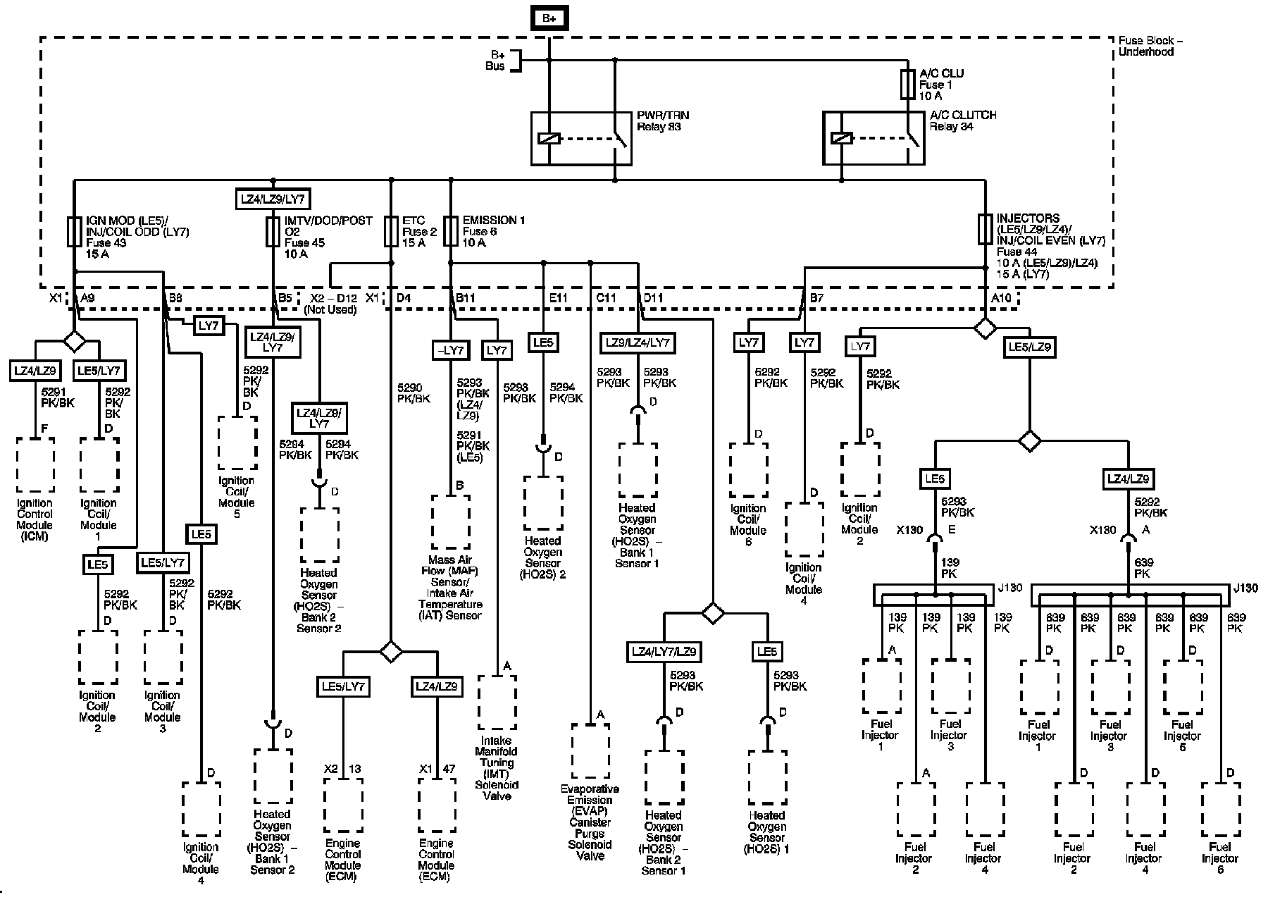 Underhood Fuse Block A/C CLUTCH and PWR/TRN Relays, EMISSION 1, ETC, IGN MOD and IMTV/DOD Fuses
